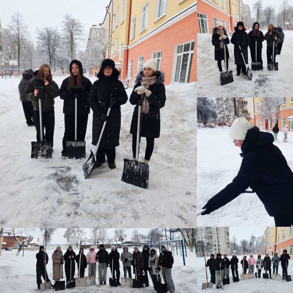Все дружно вышли, чтобы освободить школьную территорию от снежного покрова.