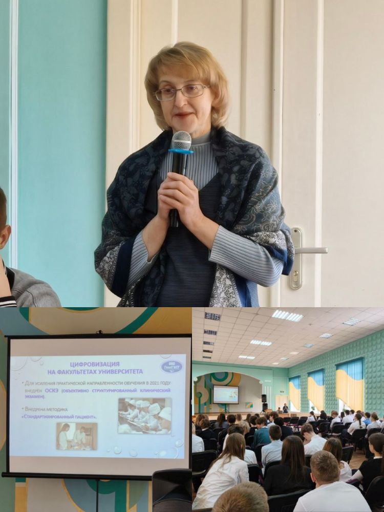 В актовом зале школы23.02.2026 состоялась профориентационная встреча учащихся 9-11 классов с доцентом кафедры внутренних болезней №2 факультета повышения квалификации и переподготовки Шут Светланой Александровной