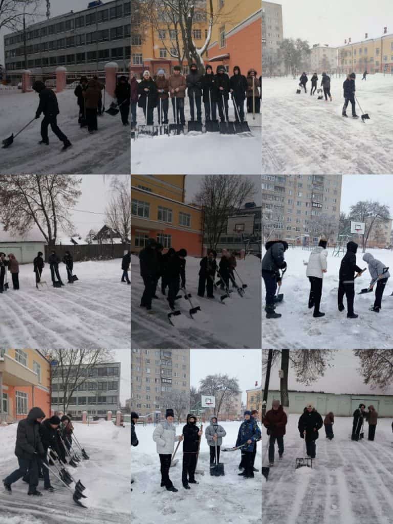 Ребята и учащиеся школы работают в команде, чтобы эффективно и быстро очистить территорию.