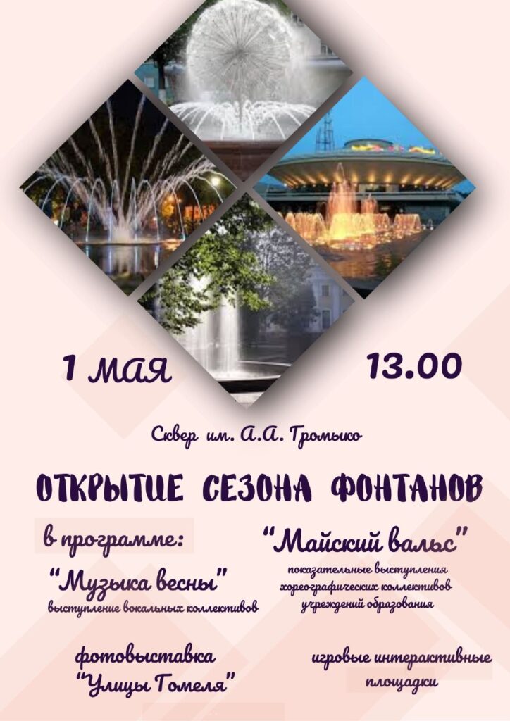 Ярким украшением Центрального района станут фонтаны у здания Цирка и в сквере имени Громыко. В Новобелицком районе — возле кинотеатра «Мир», в Железнодорожном — напротив Областной библиотеки. Советский район порадует гостей фонтаном по проспекту Речицкому, 45.