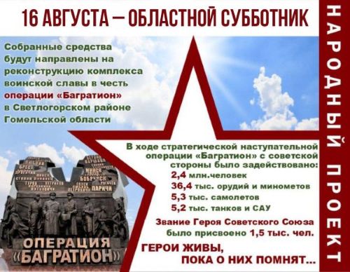 В Гомельской области 16 августа пройдет региональный субботник. Собранные в ходе него средства будут направлены на реконструкцию комплекса воинской славы в честь операции «Багратион» в Светлогорском районе