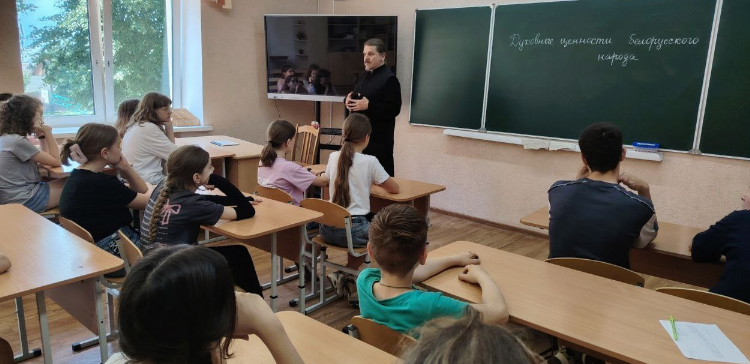 Духовная беседа воспитанников лагеря «Палитра талантов» с представителем Белорусской православной церкви на тему «Духовные ценности белорусского народа»